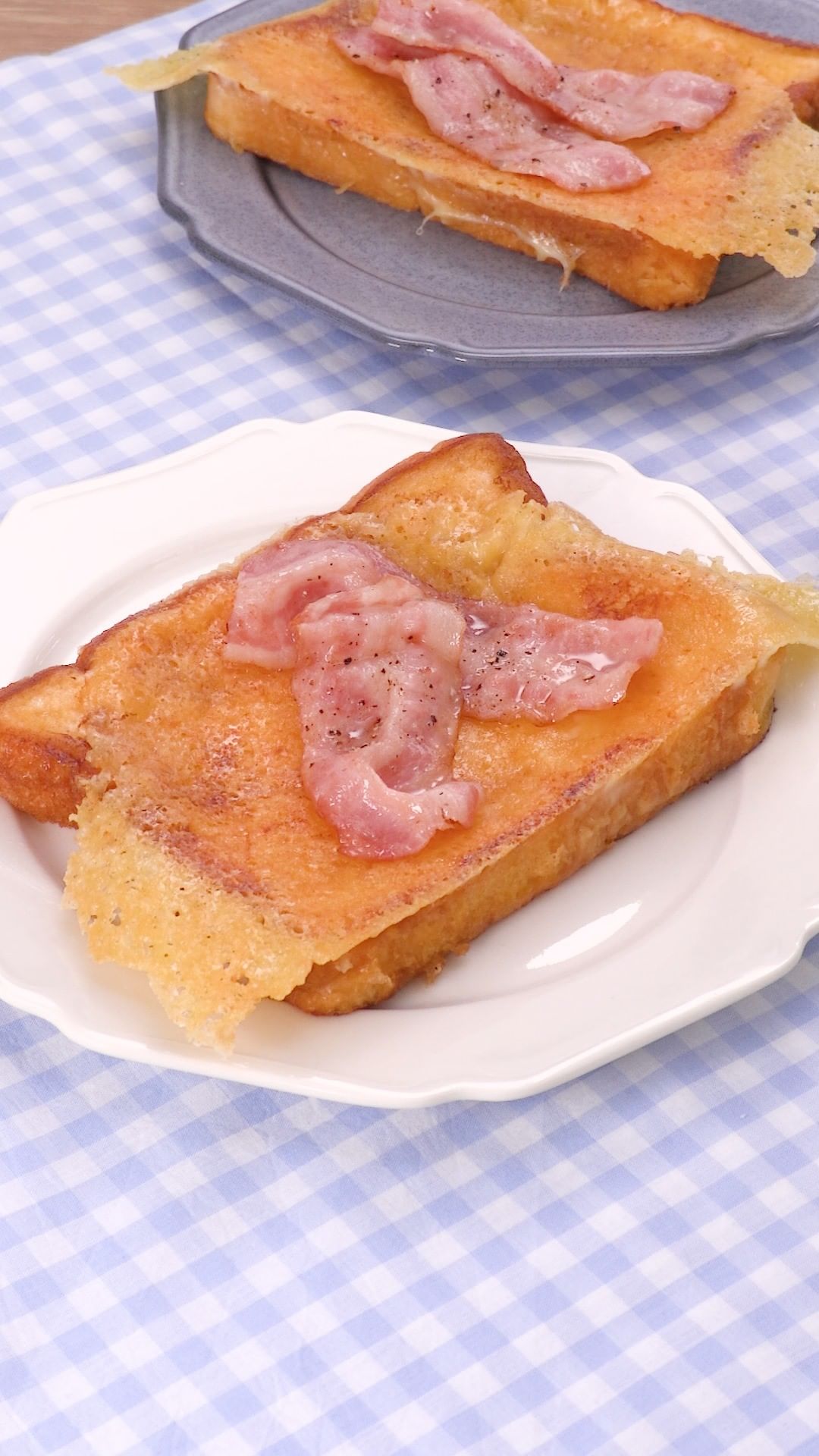 卵液の染みたフレンチトーストに香ばしく焼いたチーズを組み合わせたお食事系フレンチトーストのご紹介です♪ベーコンをトッピングして塩気をプラスしましょう!休日のブランチにいかがでしょうか?