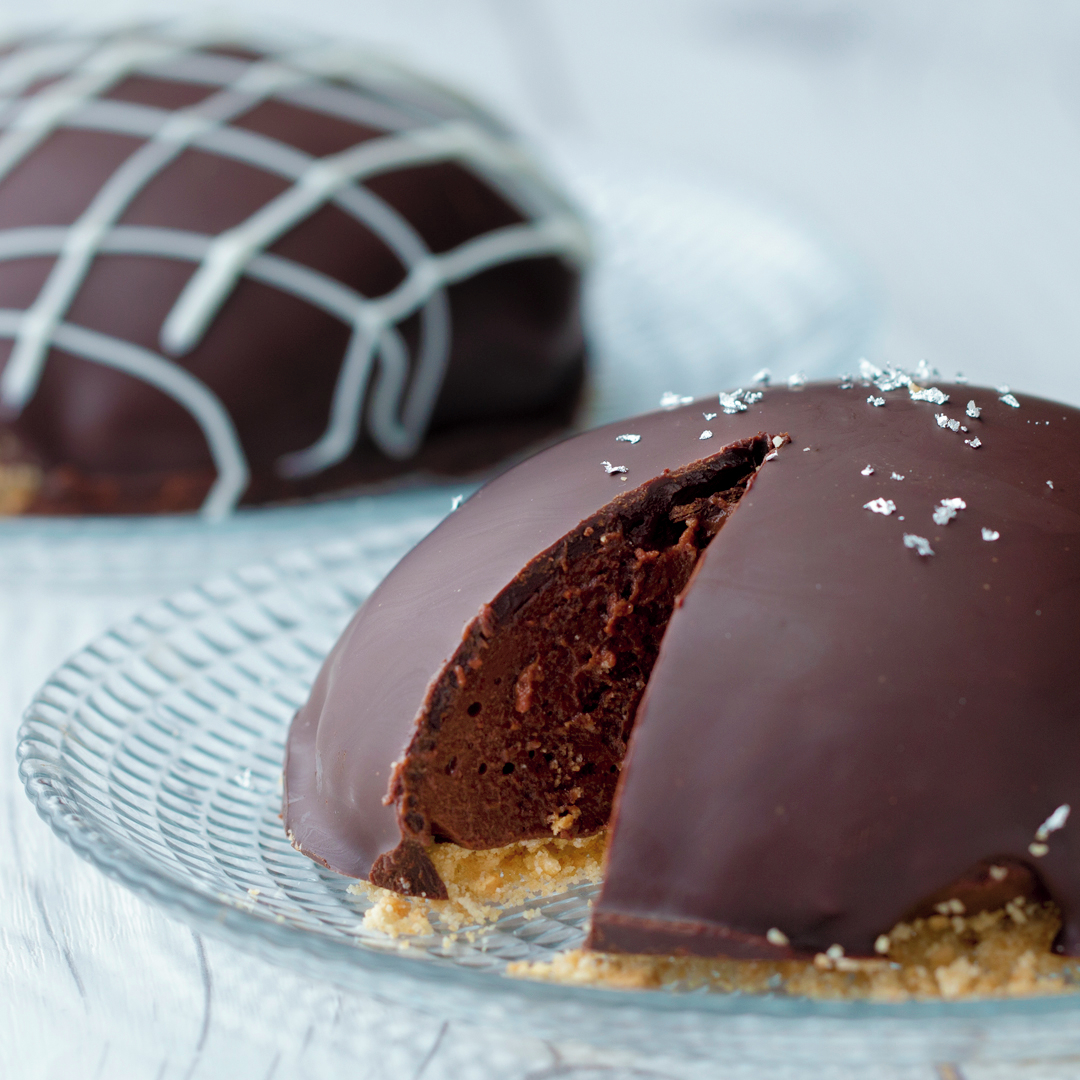 8.(7)を(6)のムース全体にかけ、冷蔵庫で2-3時間冷やす。表面が固まったら、銀粉やチョコペンでデコレーションして、完成!