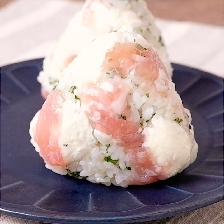 生ハムとクリームチーズを混ぜ込んで作る、見た目にもあざやか色合いのおにぎりのご紹介です。生ハムの旨味とチーズのクリーミーな味わいが、イタリアンのような風味に近づけます。すりおろしニンニクとオリーブオイルを足すことでさらに風味を引き立て、とてもおいしくいただけます。