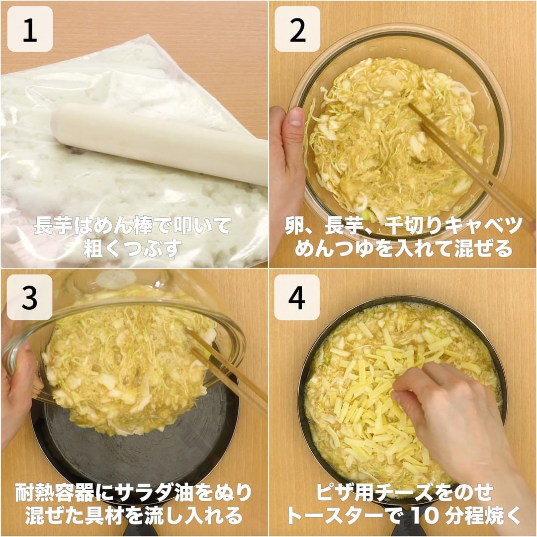 とろろと卵のとろふわ生地にたっぷりの千切りキャベツを加えてトースターでこんがりと焼きます。とろけたチーズが長芋とキャベツに絡んで後を引くおいしさになります。すりおろすのが面倒な長芋は叩くことで、食感を残した仕上がりになります♪