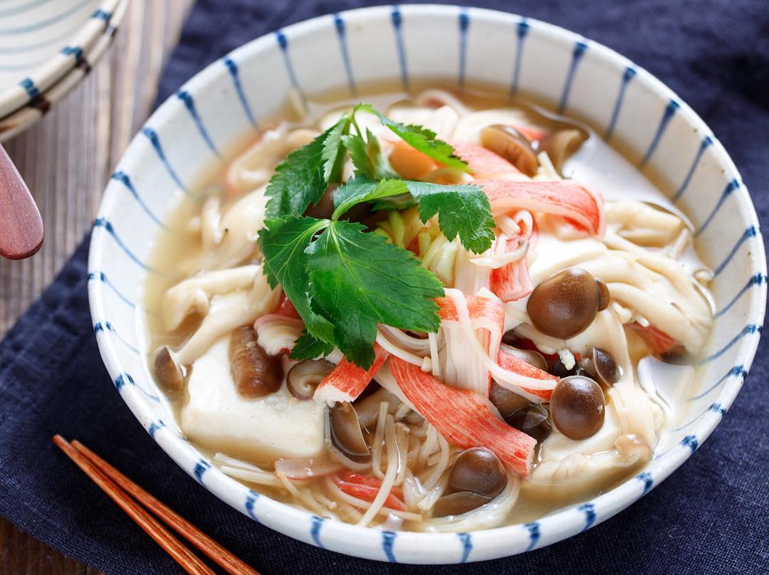①絹ごし豆腐は、ペーパータオルで包んで軽く水気を切り、食べやすい大きさに切る。お好きなきのこは、それぞれ石突きを取り、ほぐす(えのきは長さを半分に、椎茸はスライス)。