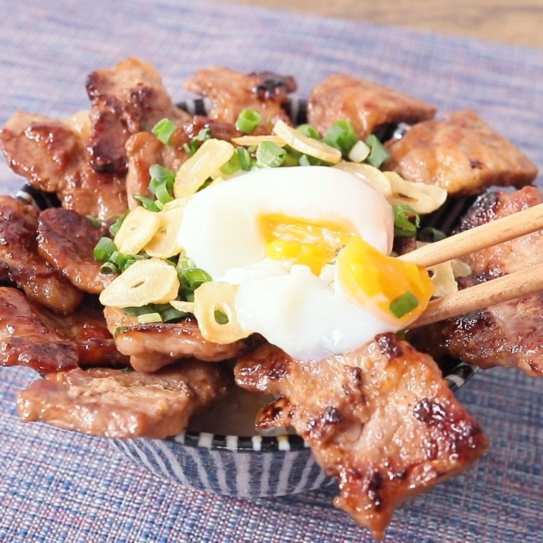 焼肉のたれで簡単に作れる、ボリューム満点のはみ出し豚丼のレシピの紹介です。豚肩ロースの脂の旨味があふれ出す、インパクト大の豚丼。焼肉のタレだけで簡単味付けなので、ささっと作れます。食べ盛りのお子さまもきっと喜ぶどんぶり飯です。