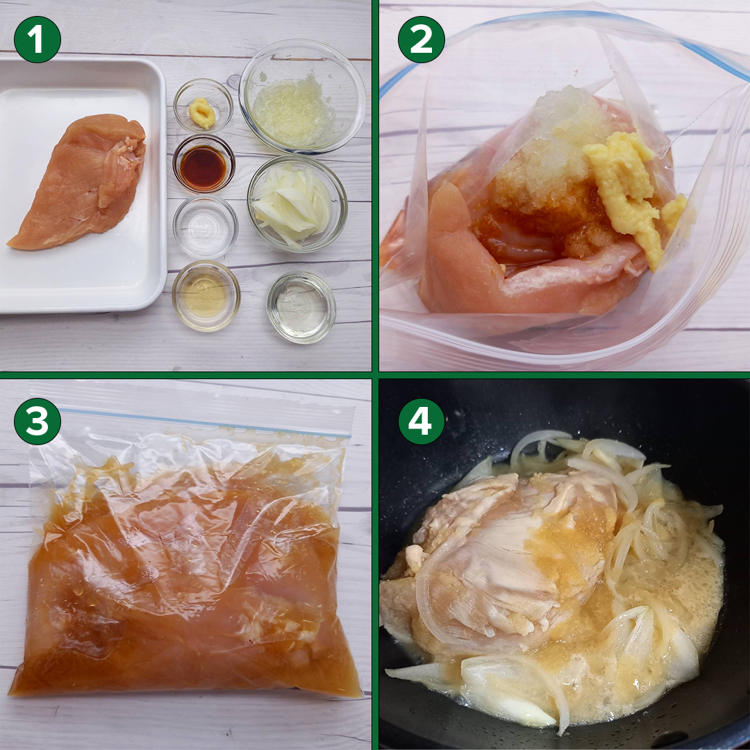 2.保存袋に鶏むね肉、すりおろし玉ねぎ、すりおろししょうが、しょうゆ、酒、みりんを入れてよく揉みこみ20分おく。