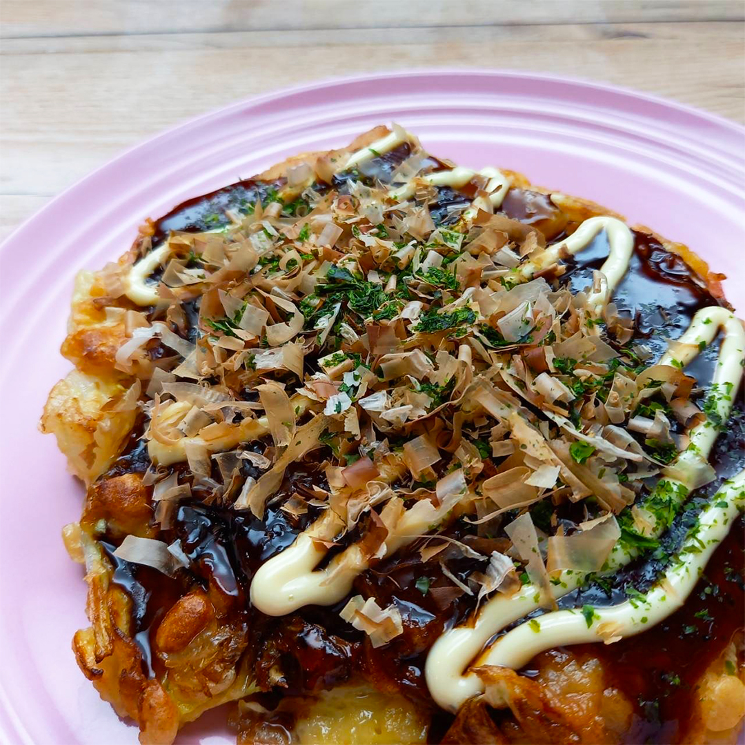 4.(3)の上にソースをぬり、マヨネーズとかつお節と青のりをかけたら、完成!