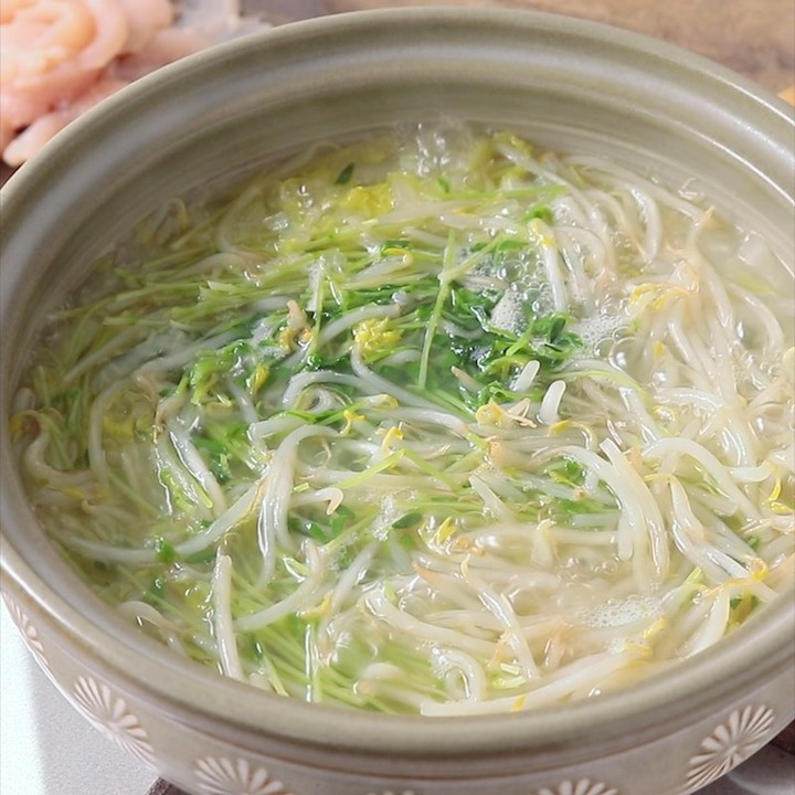 4. 鍋にスープの材料を入れ、ひと煮立ちしたら2、1、もやしを入れ蓋をして中火でしんなりするまで5分程度煮込みます。