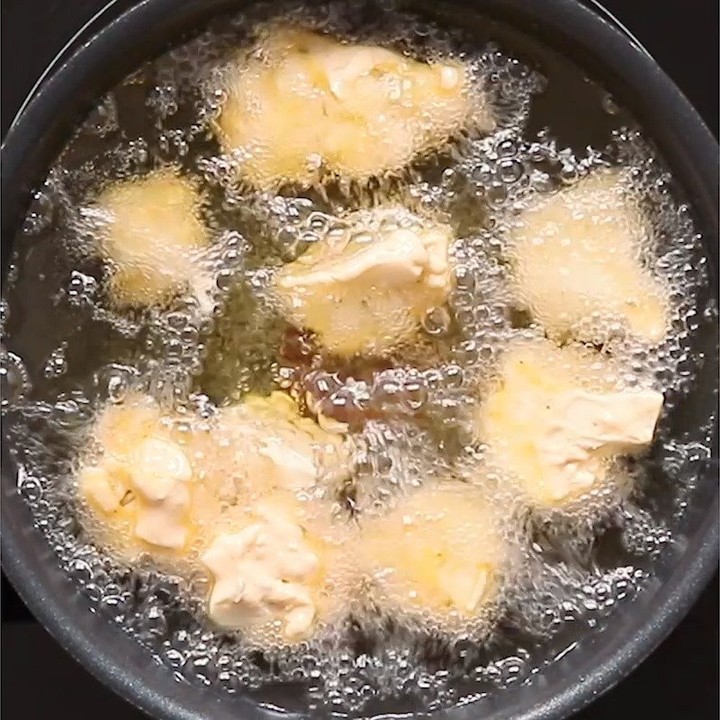 3. フライパンの底から3cm程の高さに揚げ油を注ぎ、180℃に熱し、2をひとつずつ入れます。全体がこんがりとした色になるまで2分程揚げ、油をきります。