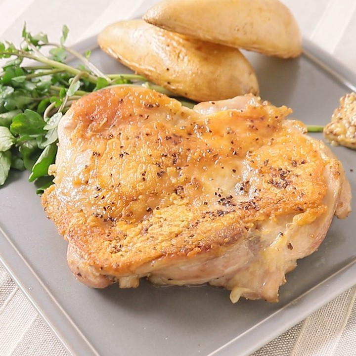 鶏もも肉をパリッと焼き上げた食感豊かなチキンソテーのご紹介です。表面に焼き色をつけてからゆっくり焼き上げることで、ふっくらジューシーに仕上がります。シンプルに塩こしょうで味付けをし、マスタードをつけてお召し上がりください。 .