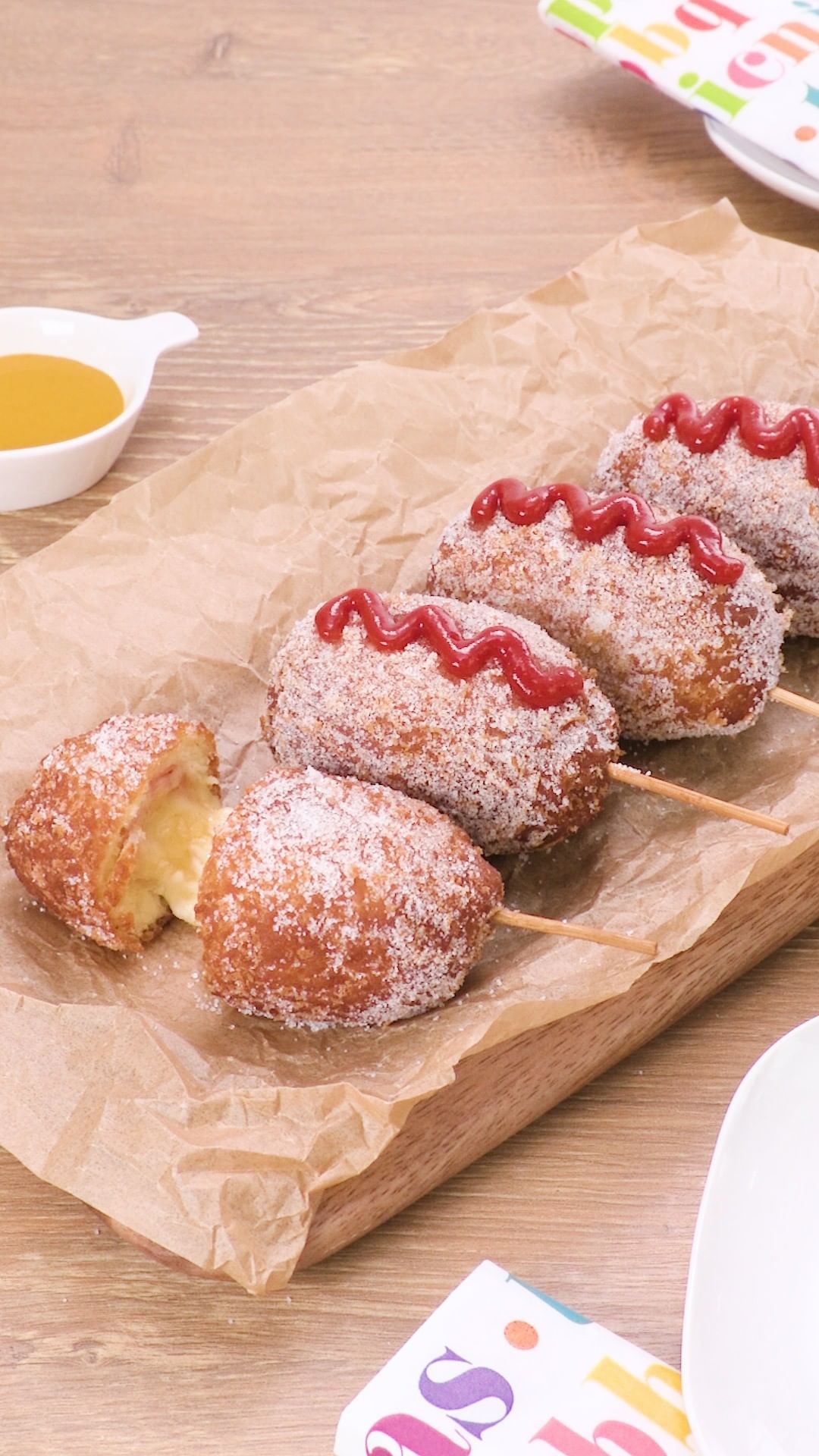 一口サイズなので生焼けの心配もなく、手軽に出来るハットグレシピです♪ホットケーキミックスを有効活用しましょう!チーズがのびるビジュアルはみんなが笑顔になること間違いなし♪