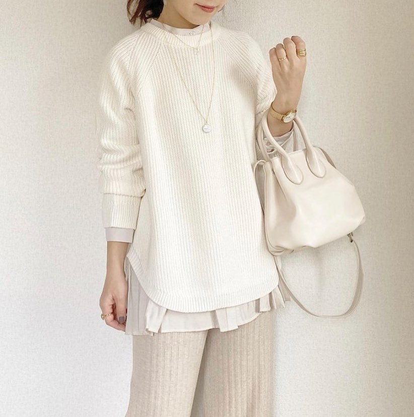 さっぱり、さらっとした素材感が爽やかな、コットンブレンドラウンドヘムセーターに❗️人気のギャザーフレアロングシャツを、レイヤードしたスタイリングが大人っぽい👏淡いワントーンの着こなしが、トレンドライクでとっても素敵ですね🥰クルーネックに、チラ見せのシャツが良い感じ👌春まで使える着こなしです🙌是非、チェックしてみてくださいね💁♀️💕