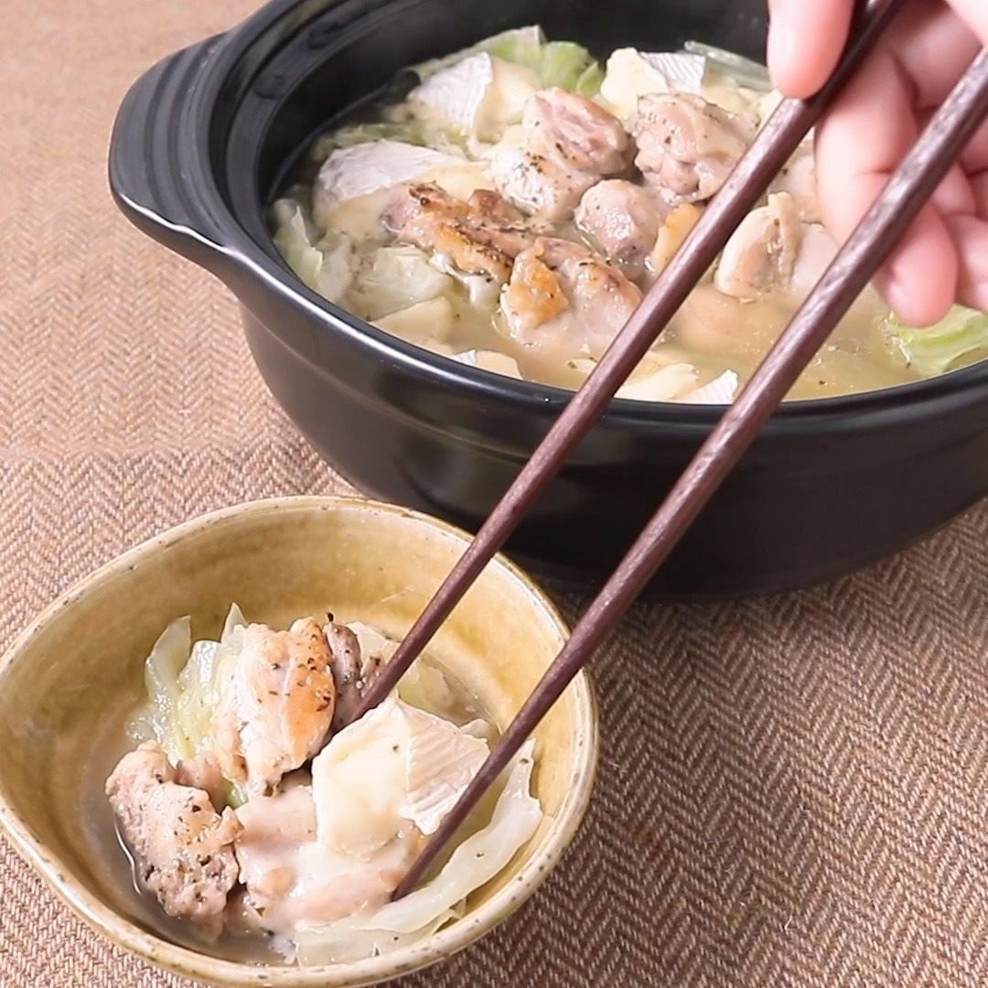 ピザ用チーズに代わりに、モッツァレラチーズや、カマンベールチーズなどでも美味しくお作りいただけます。 ———————————————————— ②『食べて幸せ!キャベツとチーズの洋風チキン鍋』 .