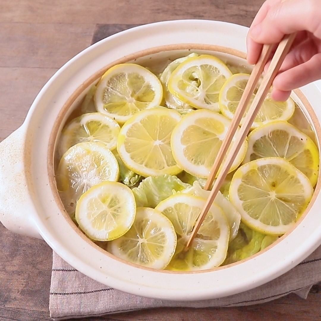 今回は直径22cm、高さ8cmの土鍋を使用しました。 ———————————————————— ③『レモンでさっぱり 洋風レタス鍋』 .