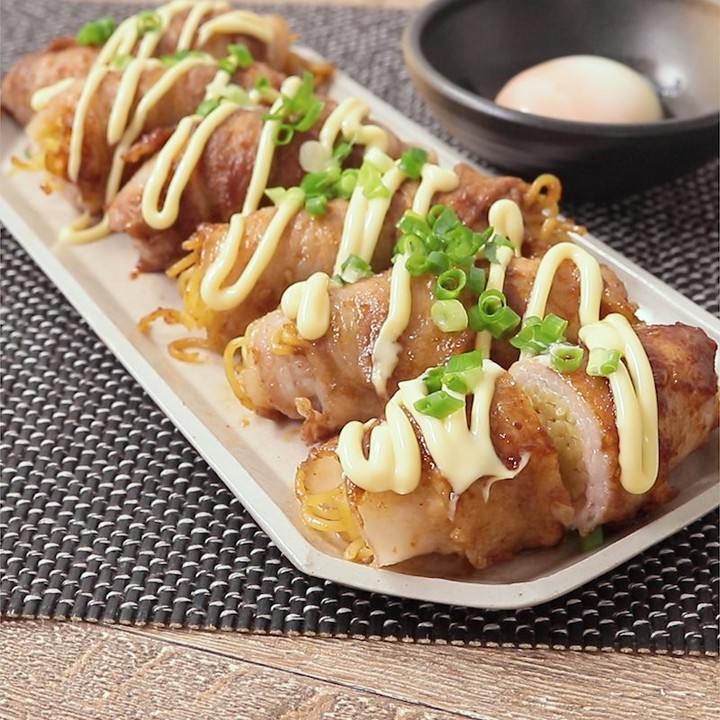 焼きそば麺を豚バラ肉で巻いた簡単でおいしい一品のご紹介です。焼肉のタレのこってりとした味付けがお酒のおつまみにもよく合い、クセになるおいしさです。温泉卵をつける事でまろやかな味わいになります。ぜひお試しください。 .