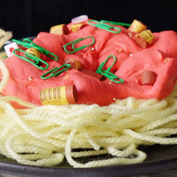 5. 茹でた毛糸をお皿に盛り、先ほどのソースをかけてお好みでクリップと消しゴムを散らしたら完成!