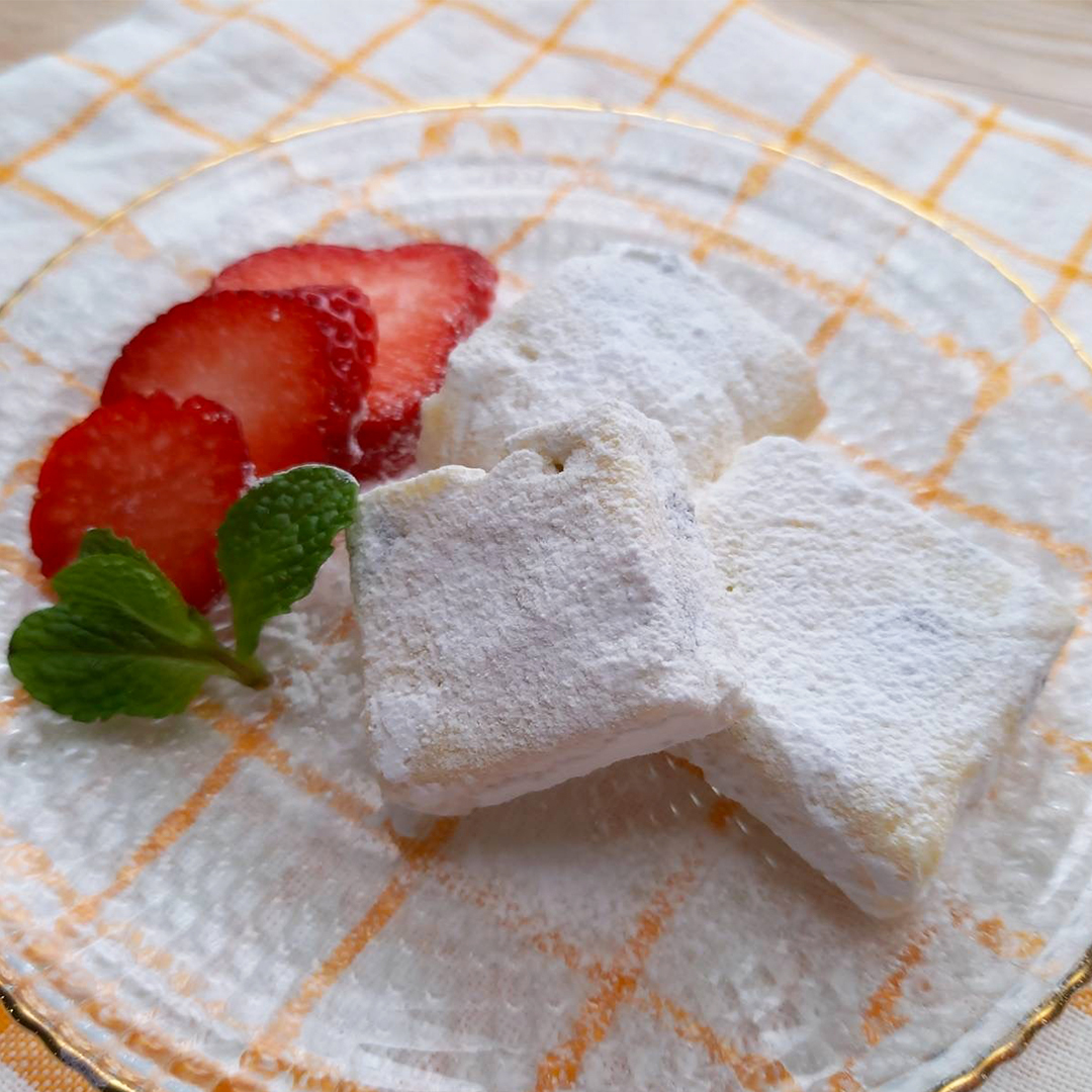 5.固まったら包丁で切り分ける。粉糖をふったら、完成!⁣