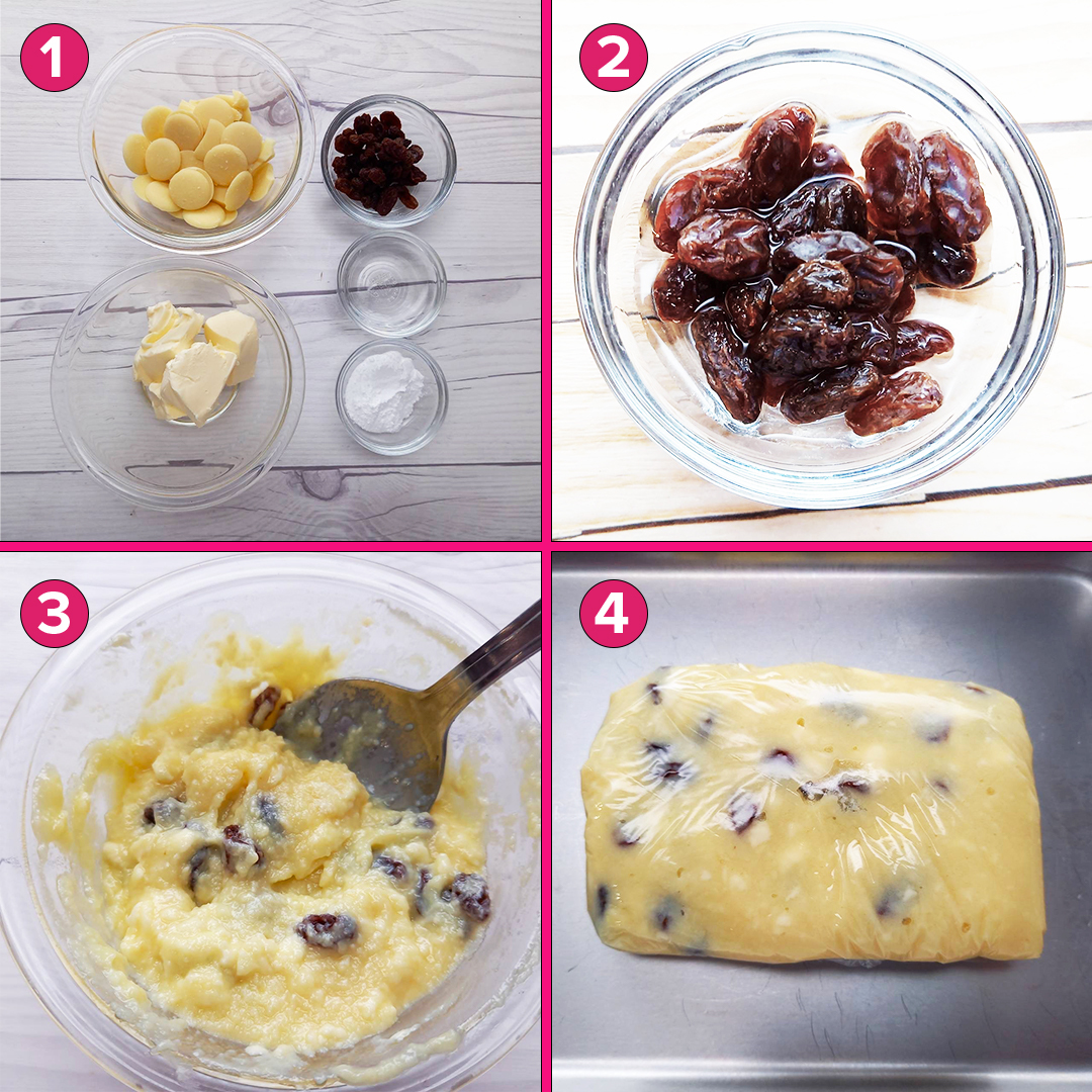 1レーズンをお湯につけて戻し、キッチンペーパーで水分をしっかり拭き取る。⁣