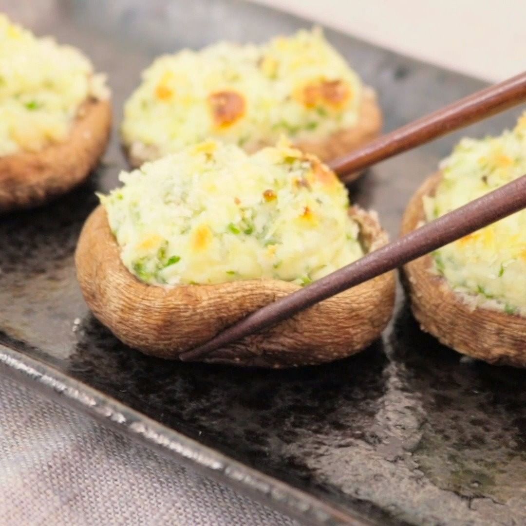 4. しいたけの軸を取り、カサの凹みに3を入れます。