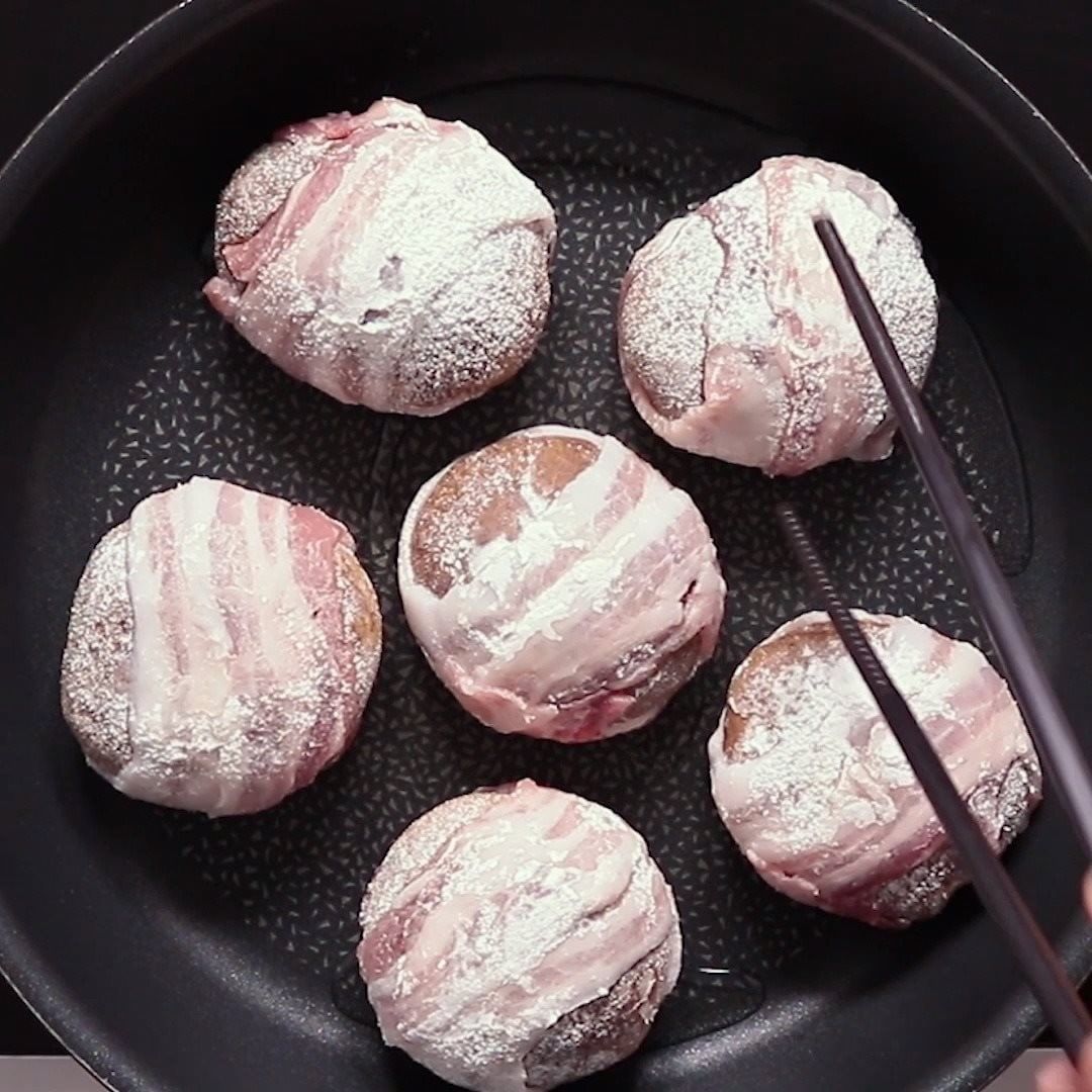 豚バラ肉で蓋をするようにしっかりと巻くことで、チーズがこぼれることを防ぎます。