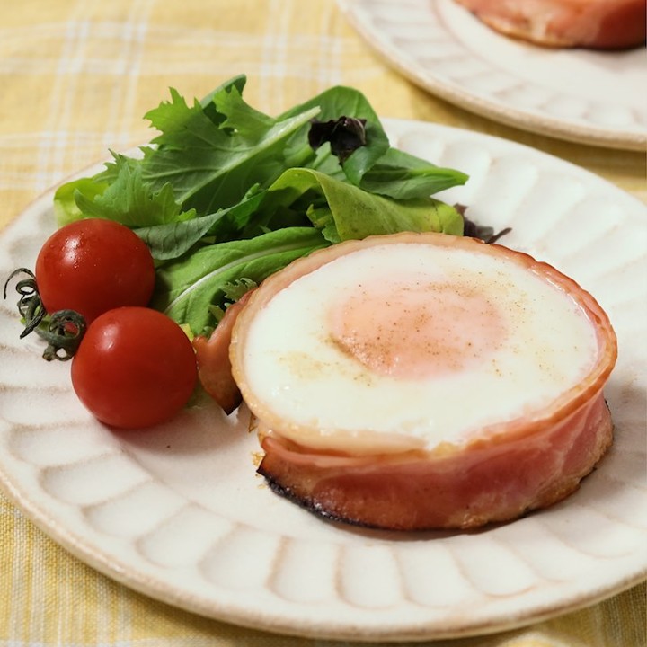 ベーコンを型の代わりにして、目玉焼きを焼いたベーコンカップのご紹介です。卵を、ベーコンに入れて焼いているだけですが、見た目もかわいらしく、少しお洒落な仕上がりになりますよ。朝ごはんの一品にいかがでしょうか。