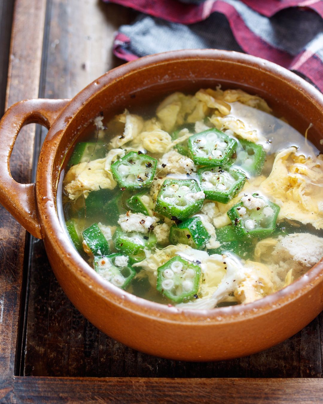 【鶏ひき肉とオクラのふわふわ♡とろみかき玉スープ】#簡単 #節約 #時短 #とろみづけ不要 #スープ