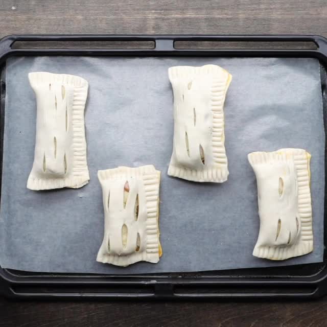 8.クッキングシートを敷いた天板に(7)を並べ、表面に刷毛で卵黄を塗る。180℃のオーブンで20-25分焼いたら、完成!