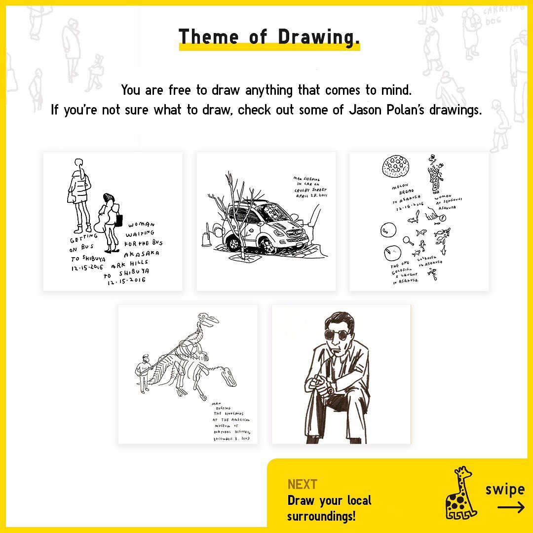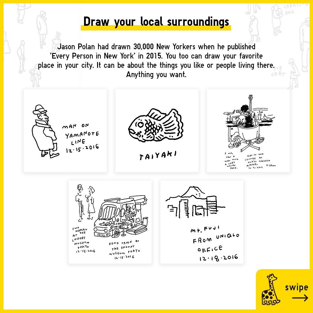 2) Draw anything that comes to mind. For inspiration, check out Jason Polan’s drawings or other submissions around the world on @worldsbiggestdrawingclub.