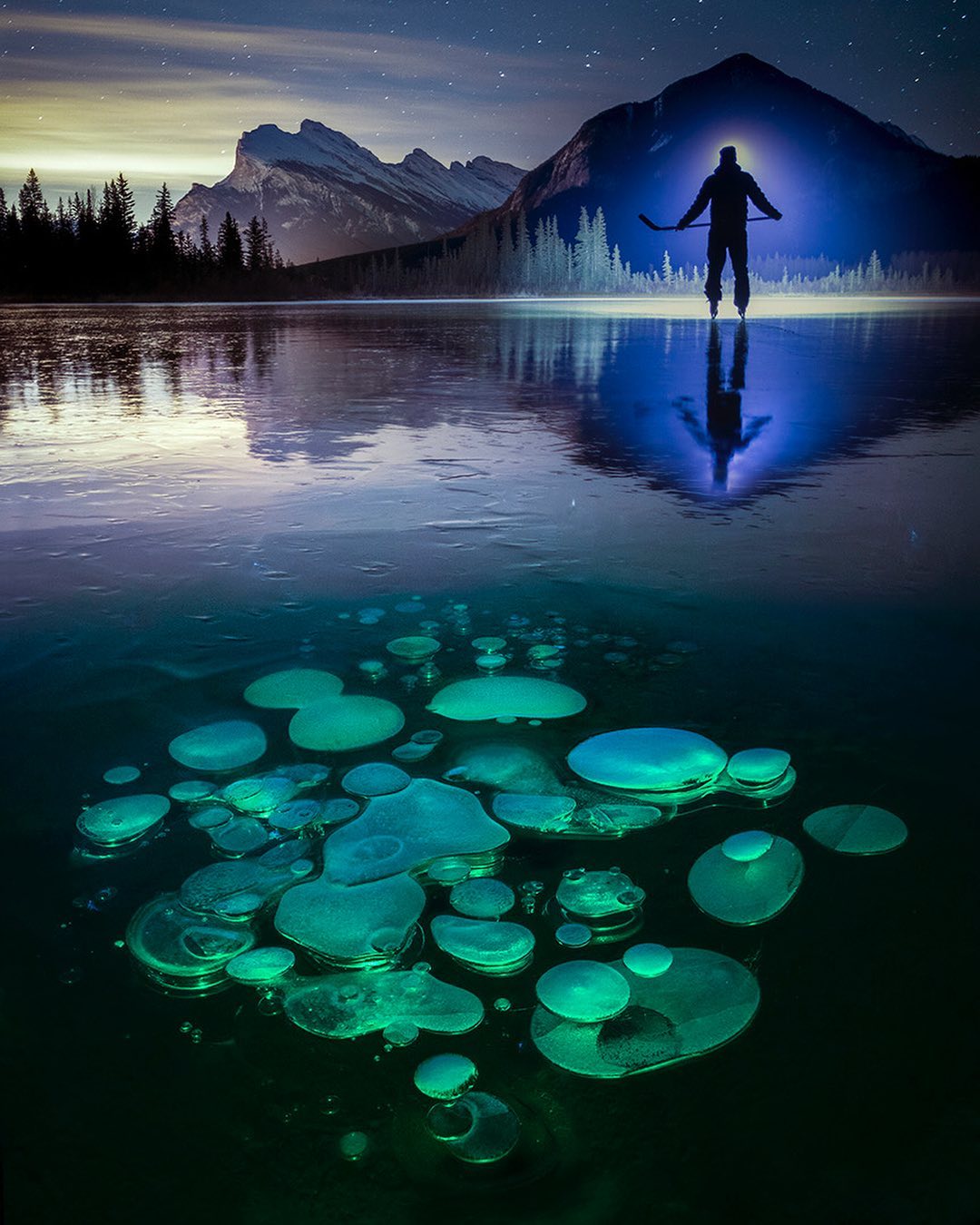 Photo by #CanonAmbassador @paulzizkaphoto “I shot this self-portrait very close to home at the beginning of pond skating season last year, when the quality of the ice was at its prime. The foreground consists of methane bubbles lit artificially. The distant lights are from the town of Banff.”
