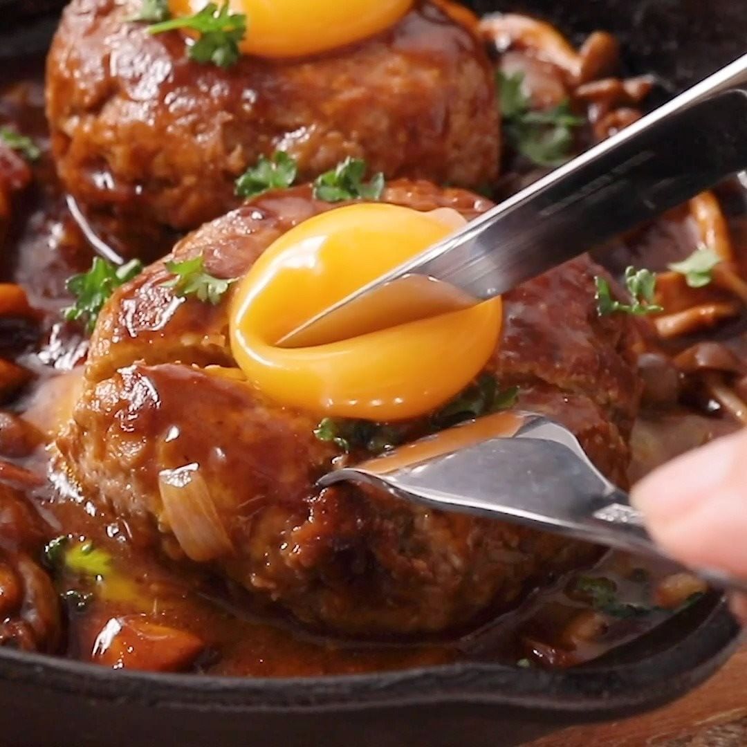 スキレットで作る煮込みハンバーグに、とろっと卵を絡めていただくレシピのご紹介です。デミグラスソースのコクと、卵黄のまろやかさがハンバーグにとてもよく合い、おいしくいただけます。豆腐を混ぜたハンバーグはふんわりとした食感でおいしいですよ。