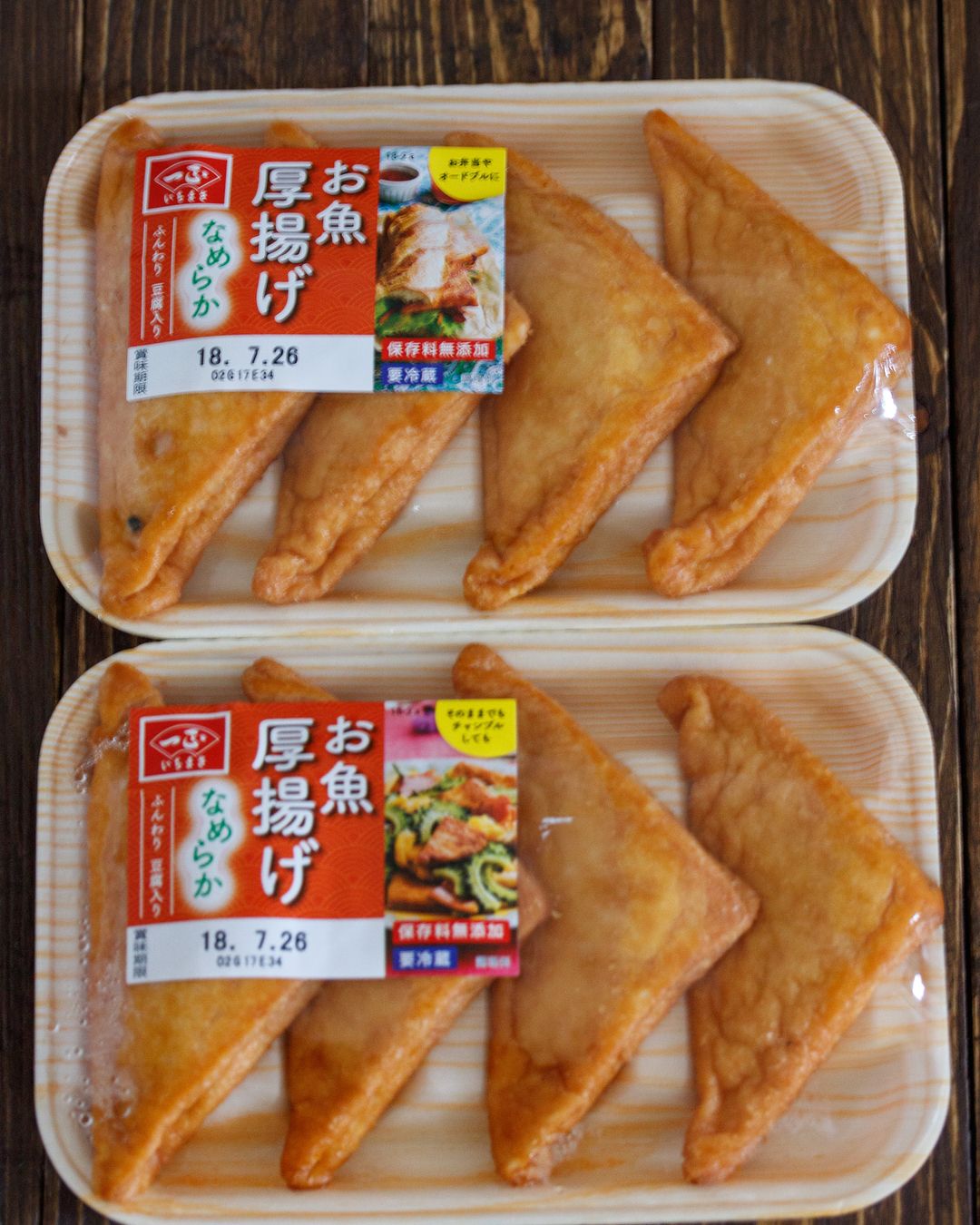 ①お魚厚揚げは縦半分に切り、切った部分から端に向かって薄切りにしていく。ピーマンは種とヘタを取り、千切りにする。