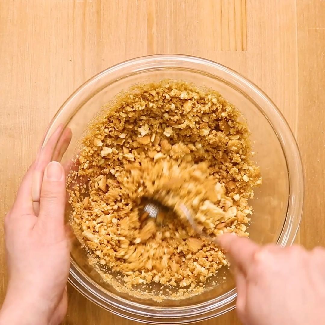 2. 溶かしバターを加え混ぜ合わせたら、型に入れスプーンで押し固め冷蔵庫で30分冷やします。