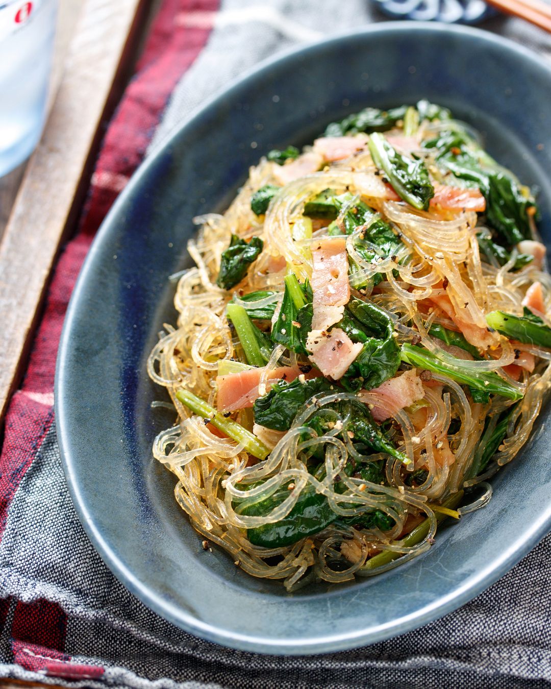 ①小松菜は葉と茎に分けてから4〜5cm長さのザク切りにし、緑豆春雨は熱湯で袋の表示通り茹でて戻す。ベーコンは短冊切りにする。