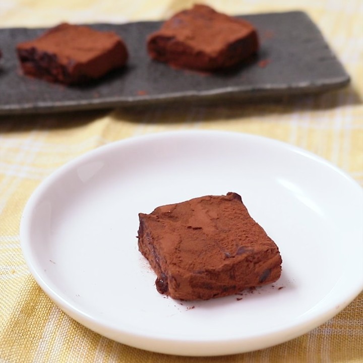 5. 取り出して、2cm角に切ったら、ココアパウダーをまんべんなく振ります。お皿に盛り、完成です。