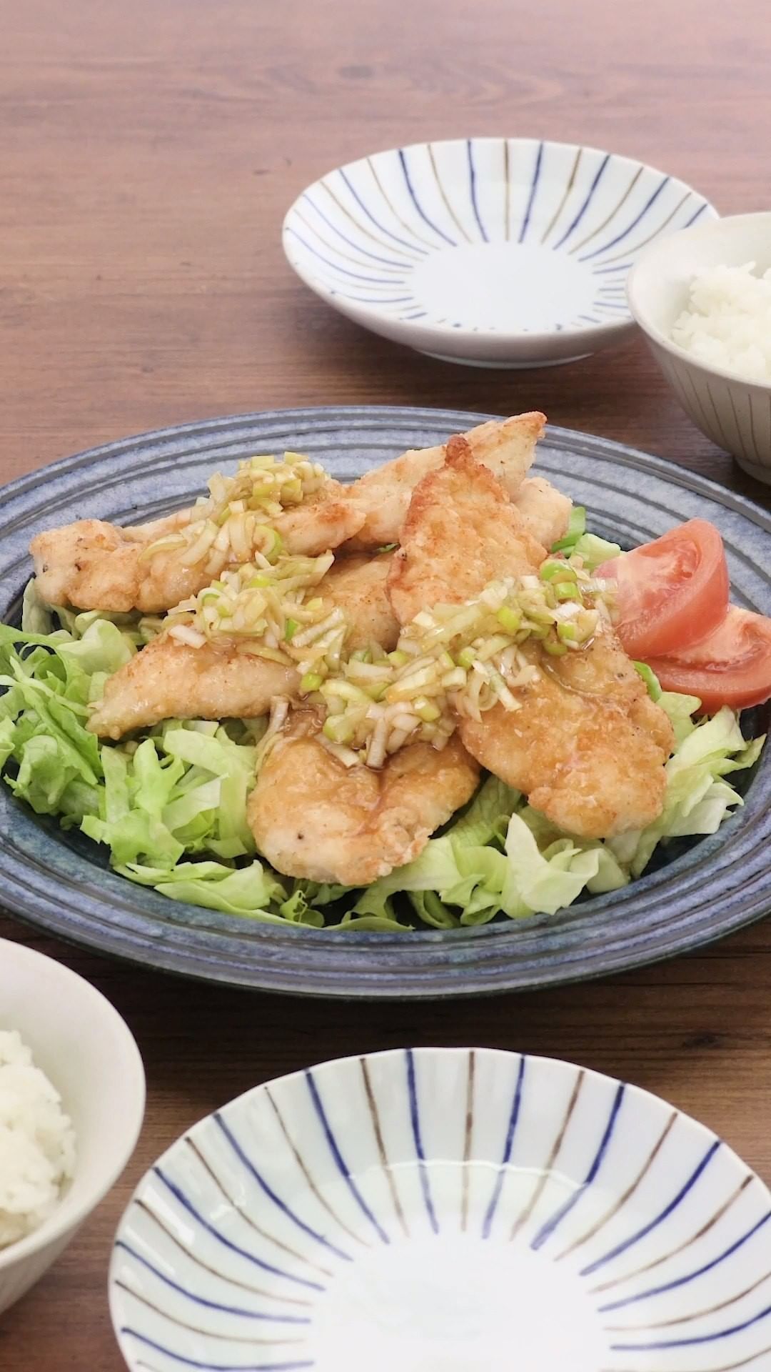 人気の油淋鶏をささみで作ります♪ささみを叩いてのばせば、揚げ焼きにしやすくカリッと仕上がります。あとを引くねぎたっぷりのたれをかけていただきます。