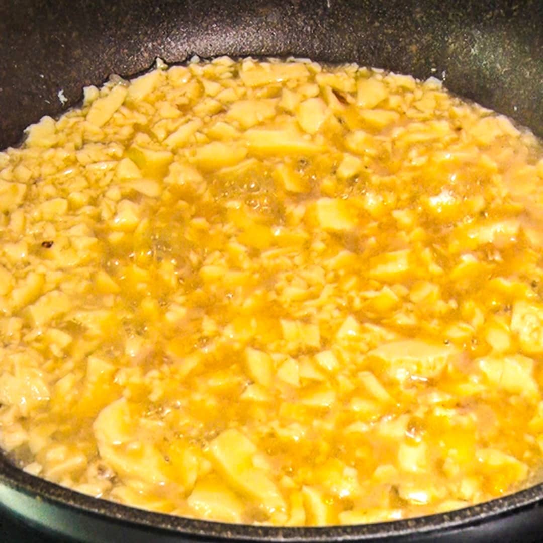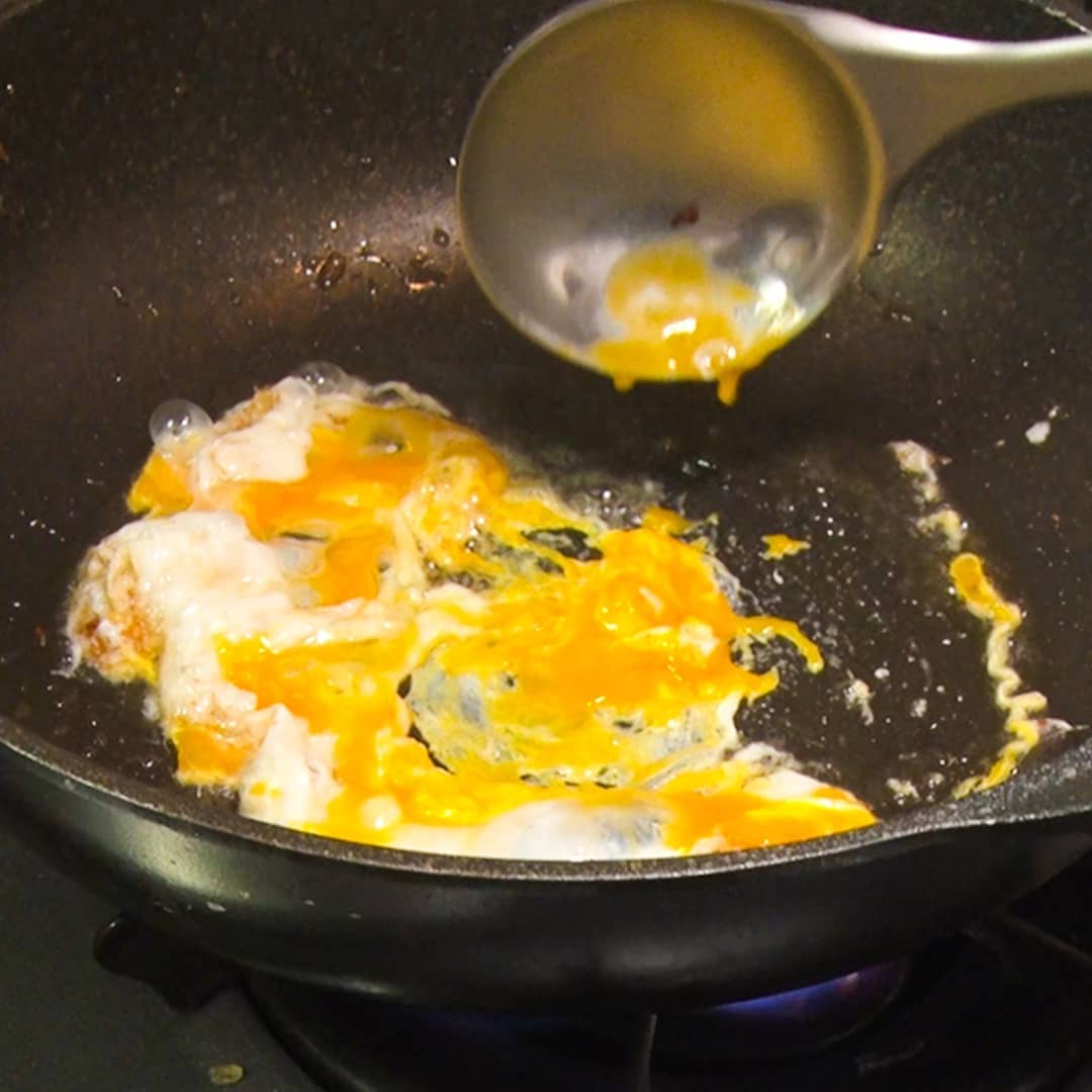 ②熱したフライパンに牛脂1個を溶かし、卵1個を割り炒める