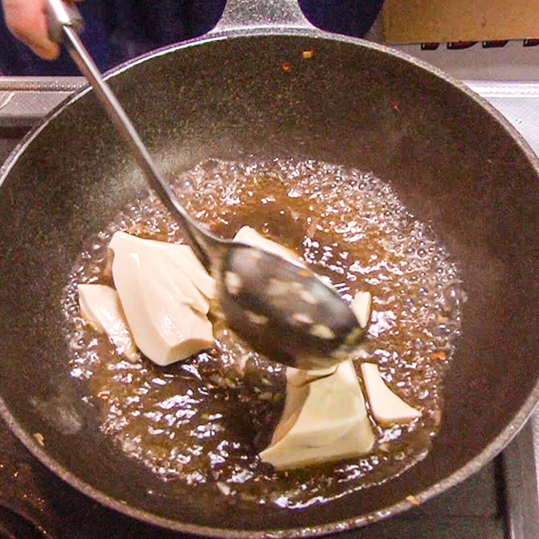 ⑧沸騰したら絹豆腐1個(150g)を入れ、おたまで細かく砕き、鶏ガラスープの素小さじ1を入れ混ぜる