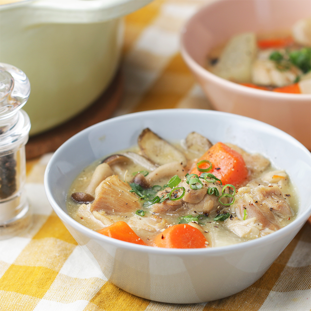 6.蓋を取り、野菜が柔らかくなったら味噌を溶かし入れ、味を見て塩気が足りないようなら塩を小さじ1/2程入れ、水溶き片栗粉を回し入れてとろみを出す。