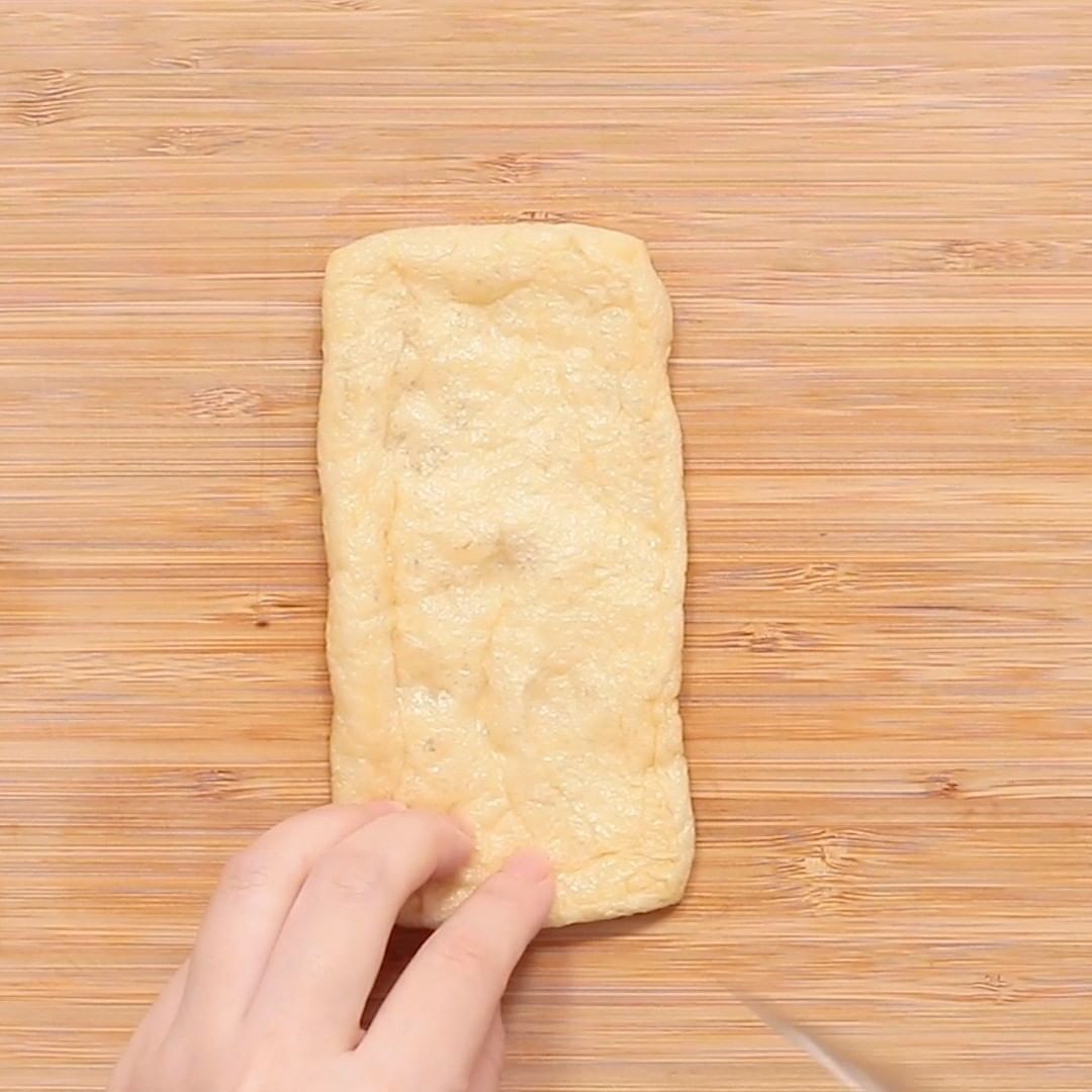 3. 油揚げは箸を転がして中を剥がしやすくして半分に切り、2を入れます。