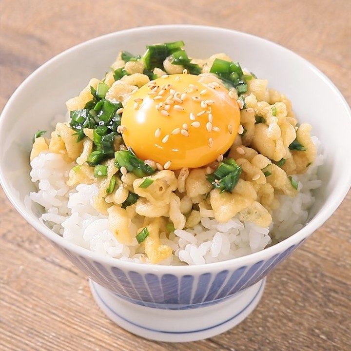 ほかほかごはんに天かすとニラの極旨ダレをかけていただくごはんのご紹介です。ニラの風味に、天かすのジューシーな味わいとサクサクとした食感を合わせて、まろやかな卵黄がごはんにとてもよく合い、やみつきになりますよ。時間のないときでも簡単に作れるので、ぜひお試しくださいね。