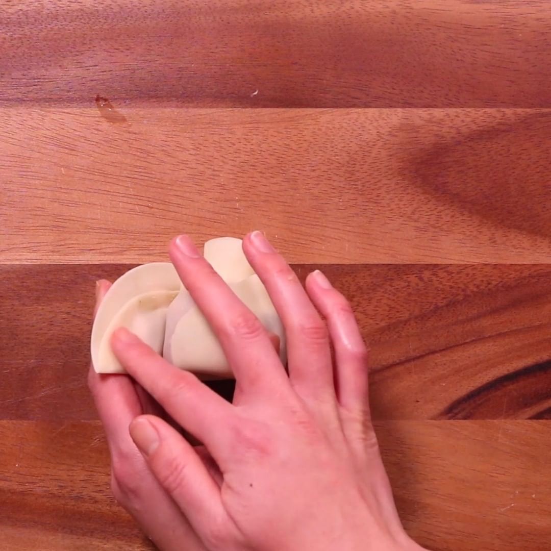 餃子の皮でタネを包むとき、なるべくピタッとするように包んでください。