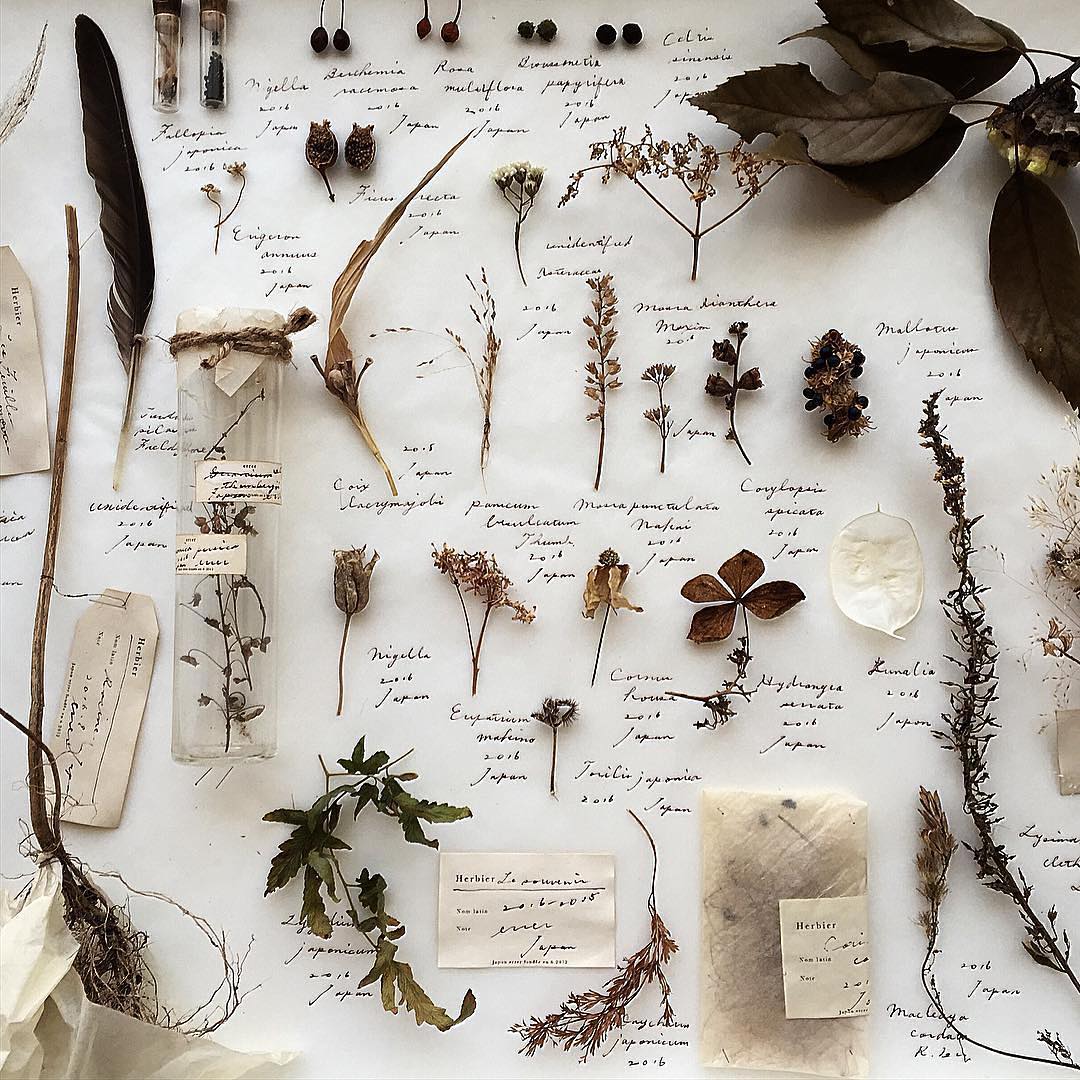 香川県高松市にある植物とアンティークの店エレー (@errer_) のオーナー河原さんが大切にしていることは、植物を採集する自分だけの時間と、標本を見たときに思い出すその時間。「人と同じではなく、自分だけのインテリアとして標本等を製作、ディスプレイできればと思い、身近な植物で標本を製作し始めました」近所の山を散策しながら拾った植物を可能な限り熱湯消毒し、乾燥させて標本にする。「植物に限らず加工する前の本物が好きなので、あまり作り込まないようにしています。標本のほかに、枯れた植物を使用して模様を製作したりしています。お客様には身近なものでいかに楽しめるかを感じて頂けたらと思っています」来客の大多数は彼女がシェアする写真をきっかけに訪れるそうだ。「製作した標本の展示会のお話をいただいたりと、大変世界を広げて頂きました。今後も引き続きいろいろな方の世界を拝見させて頂きたいとおもっております」