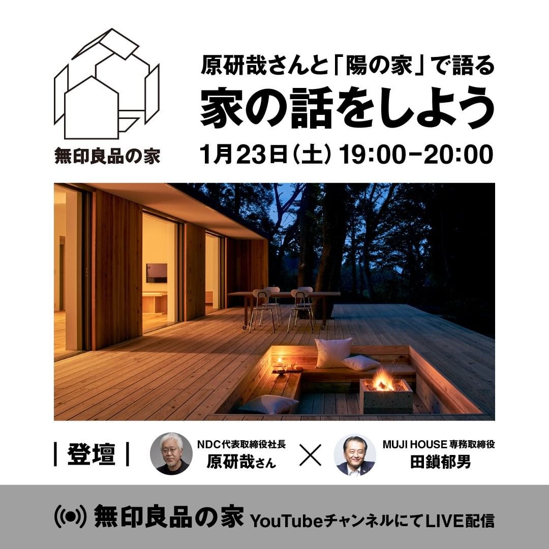 本日、1月23日(土)19:00〜 無印良品の家YouTubeチャンネルにて、日本デザインセンター 原研哉さんとMUJI HOUSE 田鎖郁男が無印良品の家づくりやこれからの暮らしについて語ります。