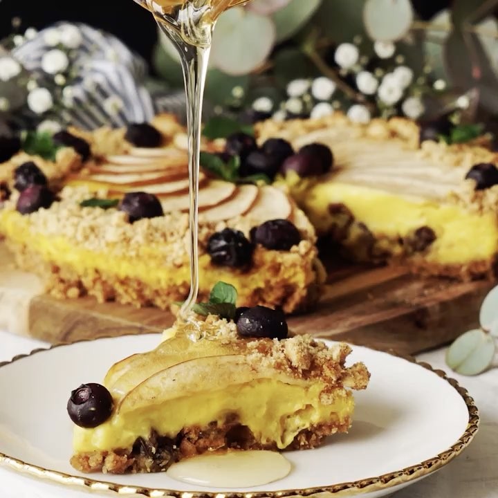 7. 砕いたダイジェスティブビスケットをりんごの周りに散らしたら、ブルーベリーを乗せる。この時お好みでシナモンを振る。