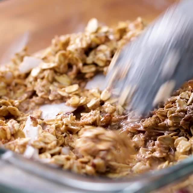 3. ボウルにオートミール、クルミ、ココナッツフレーク20g、シナモン、生姜パウダー、塩を入れて混ぜ合わせる。