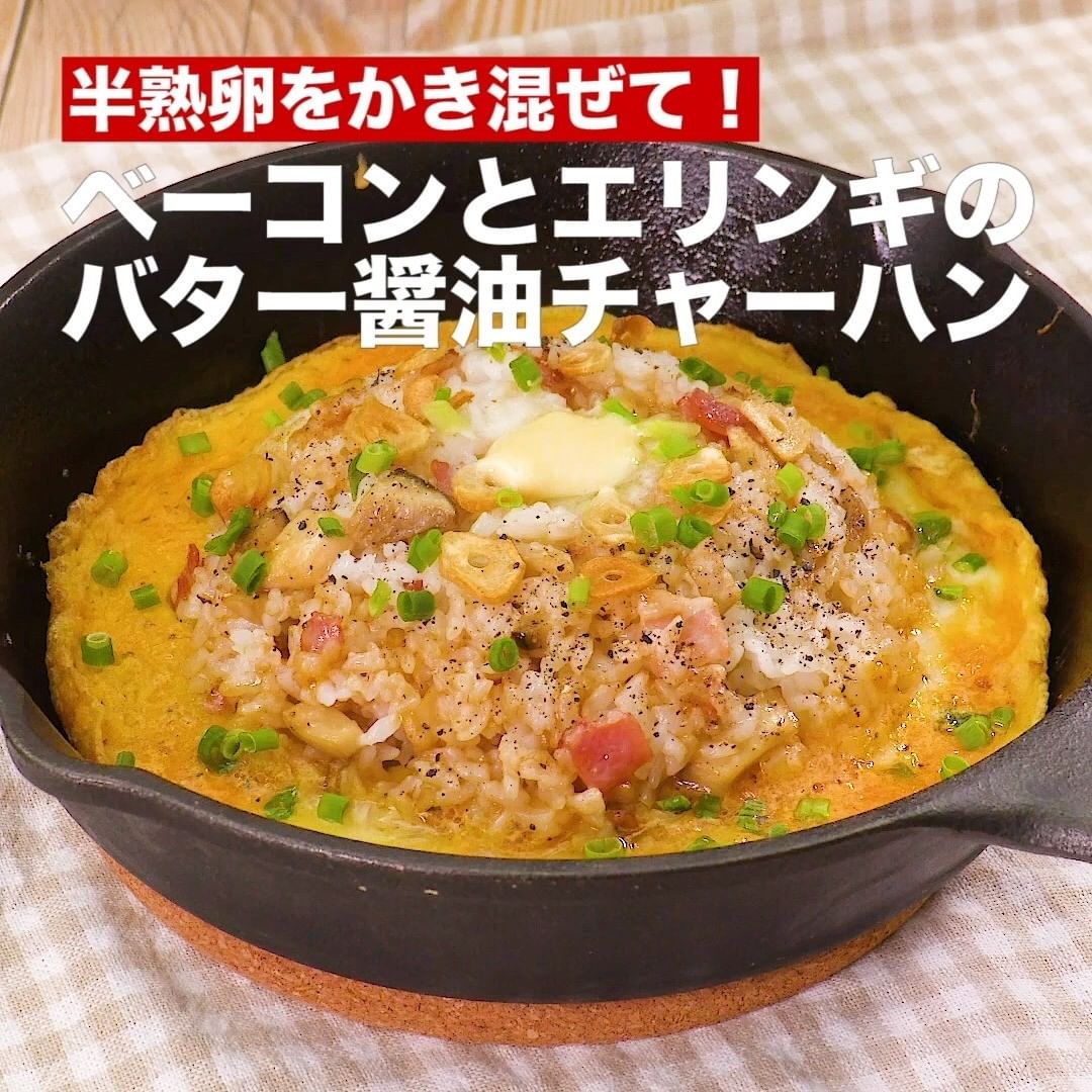 ②<半熟卵をかき混ぜて!ベーコンとエリンギのバター醤油チャーハン>
