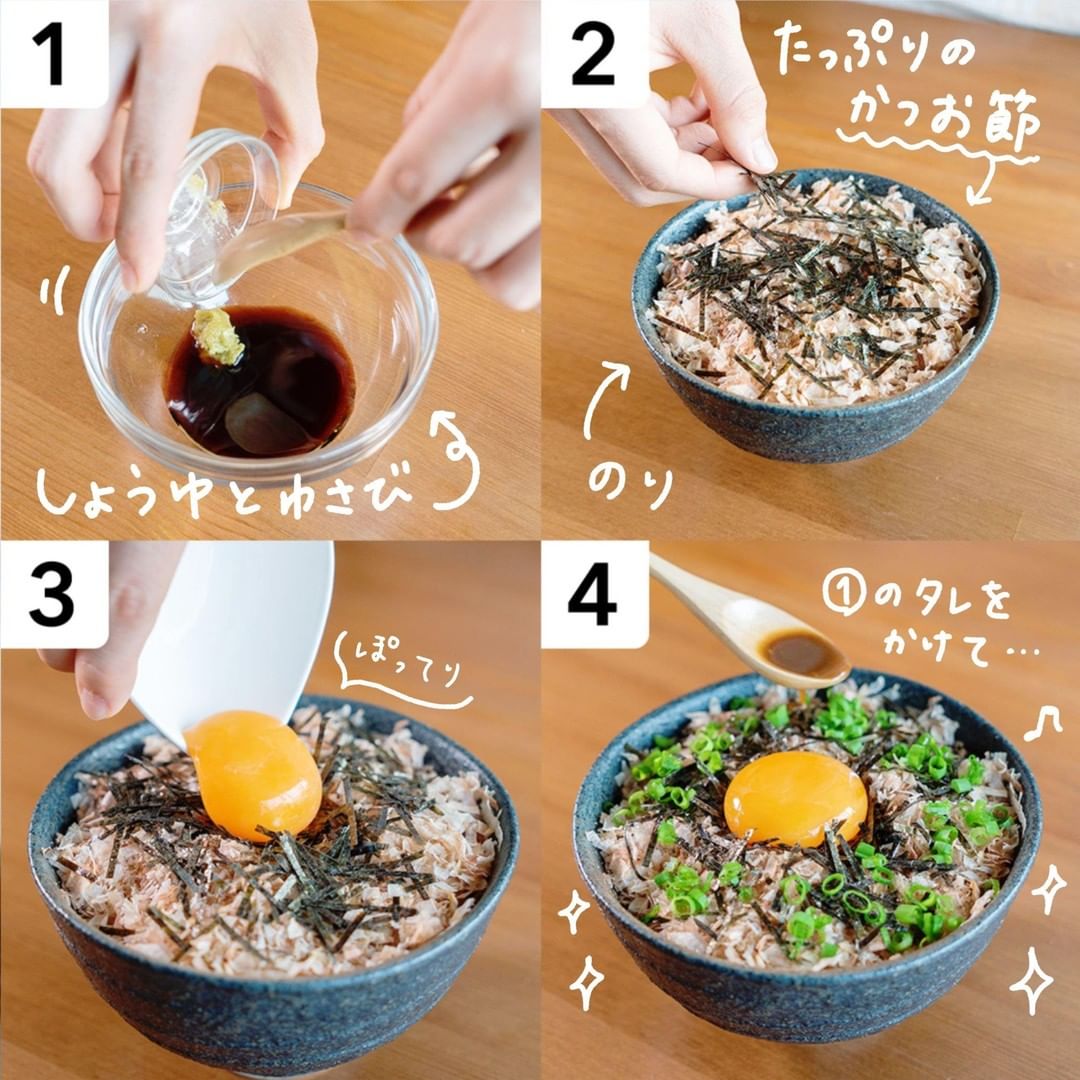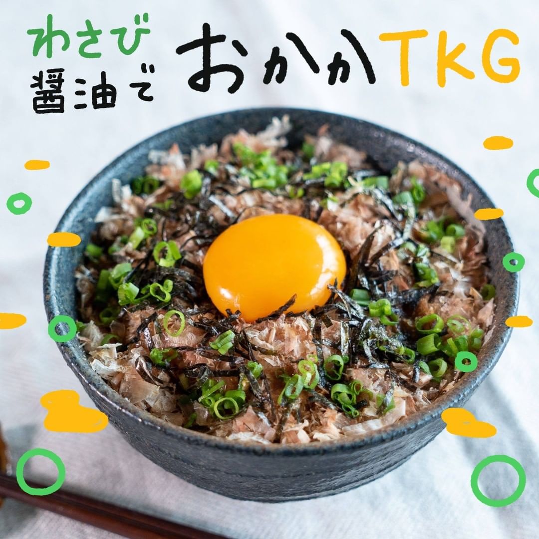 たっぷりかつお節をのせたごはんに卵黄をのせていただく卵かけごはんのご紹介です。忙しいときや、時間のないときにも簡単にお作りいただけます。しょうゆに混ぜたわさびじょうゆが味の決め手となり、やみつきになりますよ。