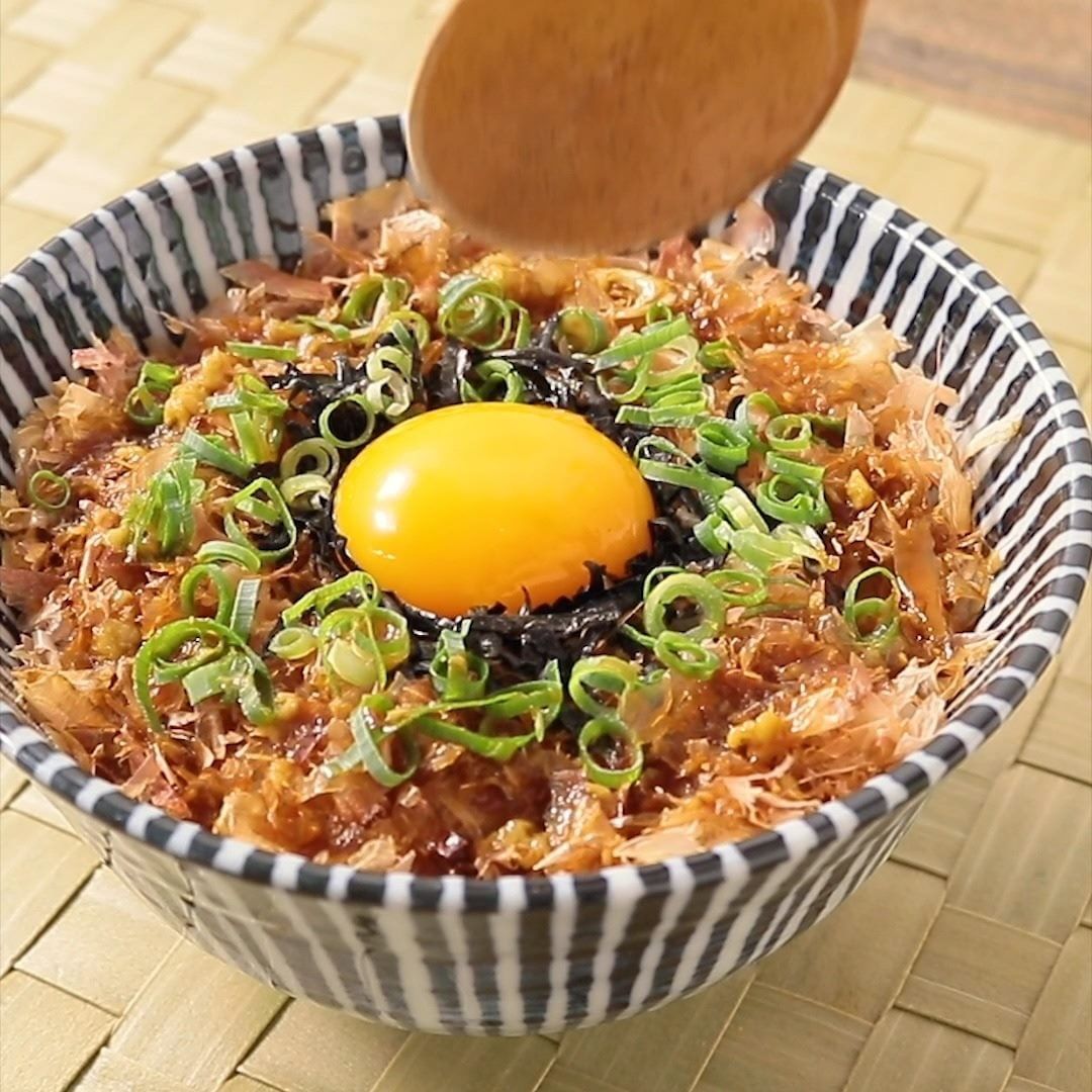 2. 器にごはんをよそい、かつお節、のり、卵黄をのせ小ねぎを散らし、1を回しかけたら出来上がりです。