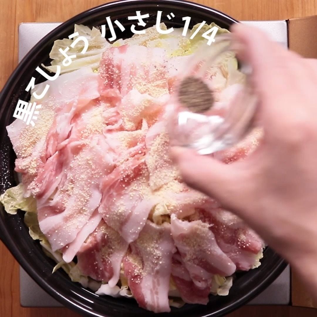 4. 鶏ガラスープの素、黒こしょうをふりかけたら蓋をし強火にかけ、ふつふつとしてきたら中火にし、7分ほど蒸し煮にします。