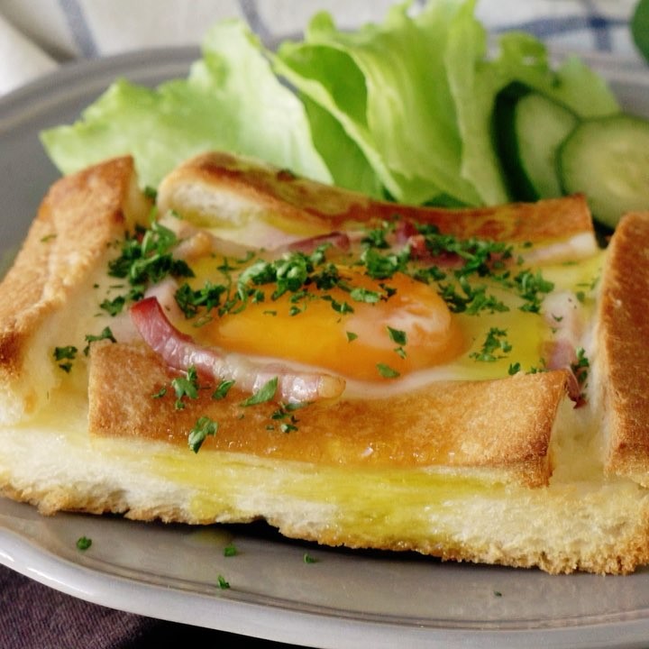 3. 2の真ん中に、1を流し入れ、卵を割り入れる。パンチェッタをのせてオーブントースターで5~6分焼く。
