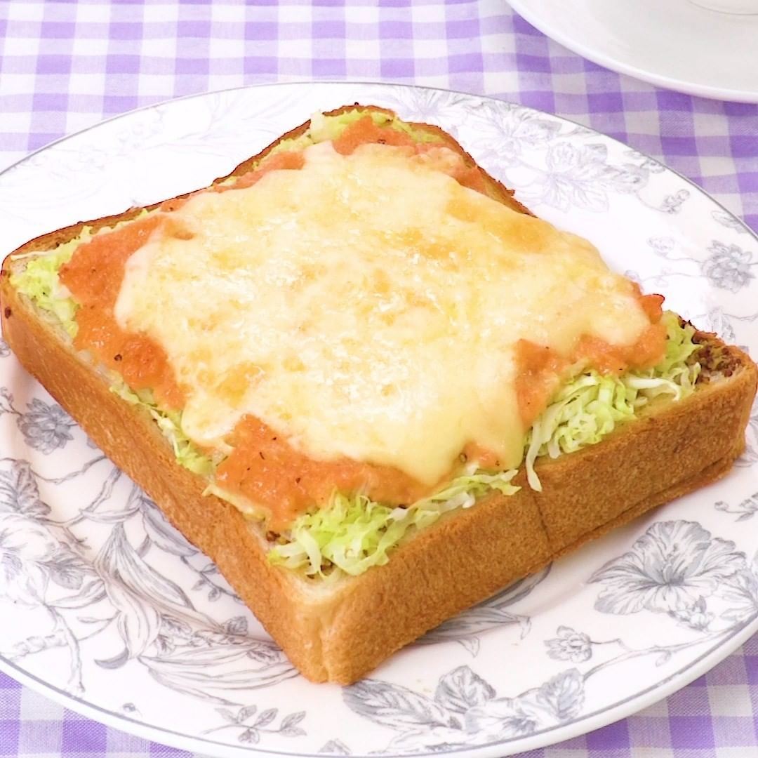 (3)食パンに粒マスタードをぬり、キャベツの千切りをのせる。鮭マヨをぬる。ピザ用チーズをかけ、トースターでチーズに焼き色がつくまで4〜5分ほど焼く。