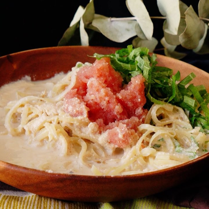 4. 牛乳にとろみがついてきたらお皿に移し、残りの明太子、大葉をのせる。