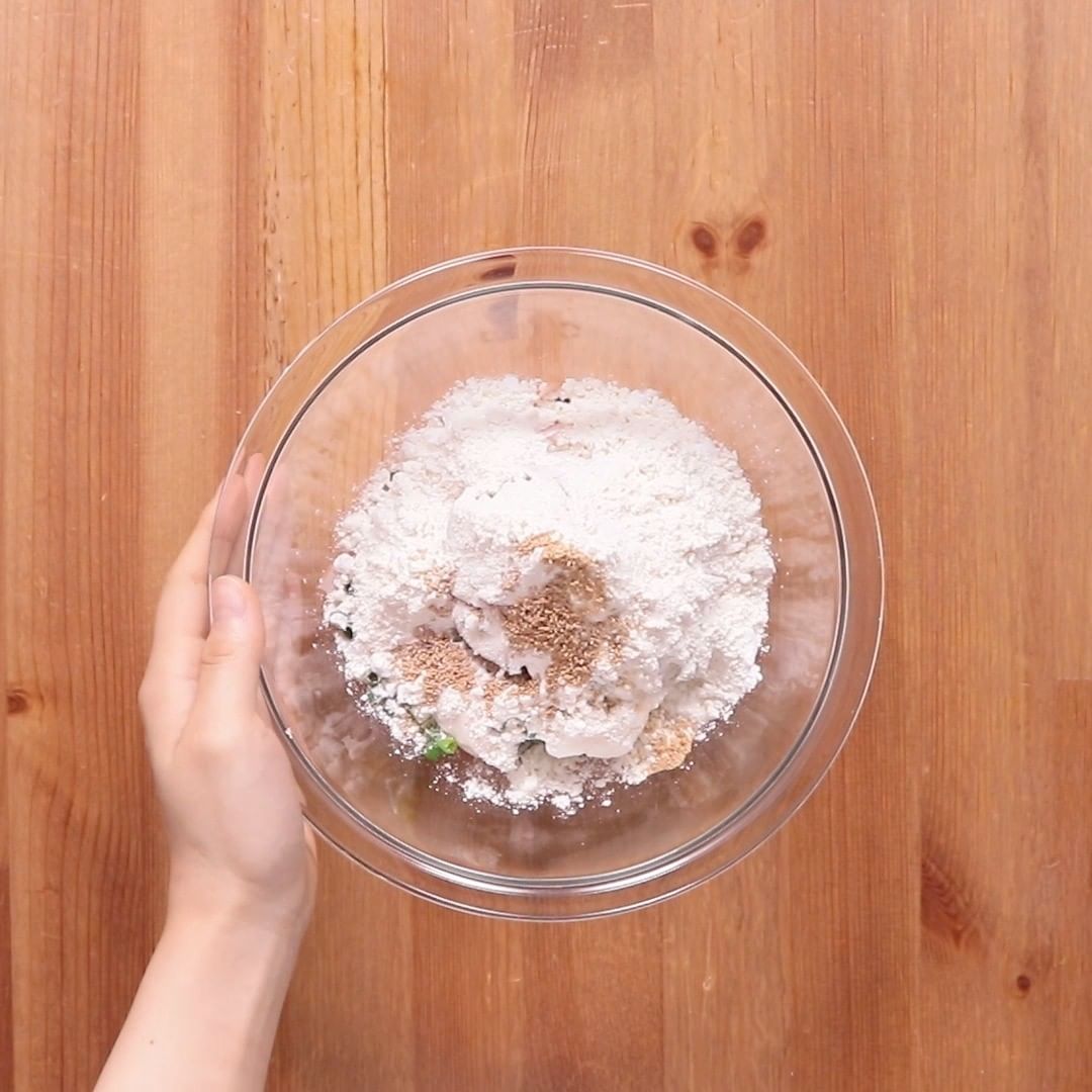 2. 1をボウルに移し、①を入れて手でこね、6等分にして丸く成形します。